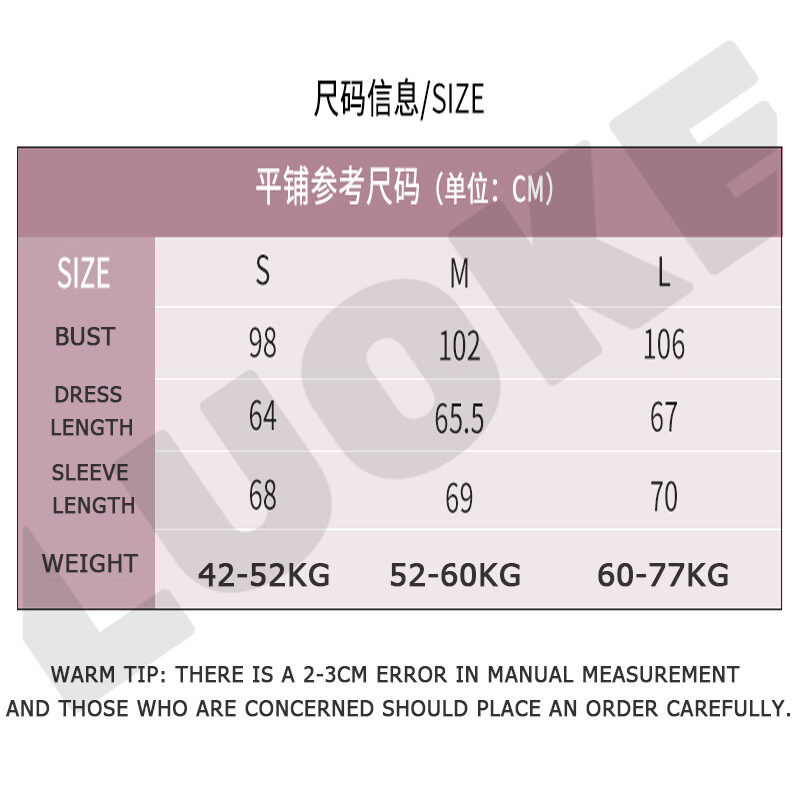 Size:L Bust:106cm Dress length:98cm Sleeve Length:28.5cm weight:60-77kg