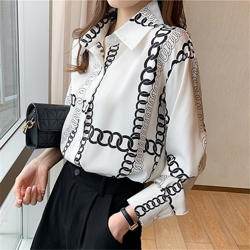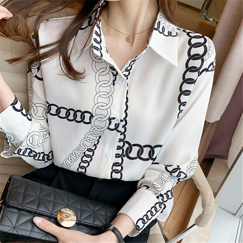 Loose Shirt Women Long Sleeve Fashion Blouse Printed Chiffon Polo Collar Korean Top Lady Clothes
