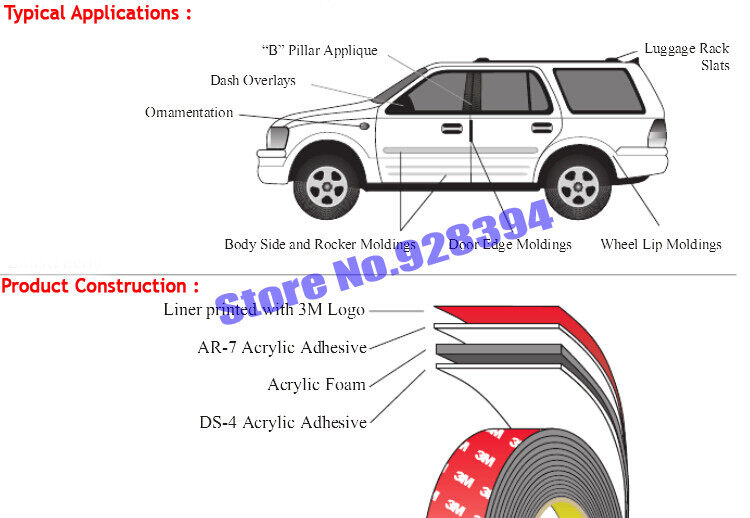 Hwo to use this tape? Clean: For maximum bond strength,the surface must be clean, dry, smooth, have no rust and oil pollution.Typical cleaning solvents are heptane or isopropyl alcohol. Pressure: Pressure on the adhesive and the surface can help improve bond strength, roller or platen can be used. Time: After application, the bond strength will increase as the adhesive flows onto the surface. At room temperature approximately 50% of ultimate bond strength will be achieved after 20 minutes, 90% after 24 hoursand 100% after 72 hours. Temperature:Ideal application temperature range is 70°F to 100°F (21degree centigrade to 38degree centigrade).Operating temperature should not be below 10 degree centigrade, the temperature is too low, will lead to cure time longer. If temperature is too low, move material and adhesive tape into the warm indoor storage or heating treatment. Q. What percent of the final bond strength can I expect immediately after application? After 24 hours? After 72 hours? A. Immediately after an application is made, about 60% of the bond strength is achieved. As the adhesive continues to wet-out the surface, you can expect the bond to be at about 75% - 80% after 24 hours. After 72 hours, 95%+ of the bond strength is achieved. The bond will continue to build with time. Q. Is the tape solvent resistant? A. Yes, 3M acrylic foam tapes are resistant to most common automotive solvents like gasoline, diesel fuel, washer solvent, etc. Solvent resistance is a function of type of solvent, time of exposure and temperature. Q. Why doesn`t the tape feel sticky? A. 3M`s high performance acrylic adhesives tend to be firm and dry to the touch. They are designed to bond materials other than skin. The adhesives used are designed to give optimum performance and adhesion to automotive substrates and components. The natural oils and moisture of skin can vary from person to person and affect the "thumb appeal" of the 3M Acrylic Foam Tape. To one person the tape can feel very sticky and to another it can feel much less sticky to the touch. The difference in "thumb appeal" is in the variation of the 2 individual`s skin surfaces not the adhesive. Q. The part is not adhering to the vehicle. What might be wrong? A. Areas to investigate for poor adhesion or performance include: Check for surface contamination. The substrates must be clean and free of any contaminant. This is the most common cause of poor adhesion. Check for surface match. Are the two surfaces to be bonded a good match? Check for proper application pressure and wet-out. Check the back of the component for flatness. Check the installation process for proper procedures.