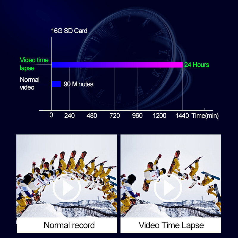 • Loop video: Optional 1/2/3/5 min, new file auto overwrites old file when the card is full.