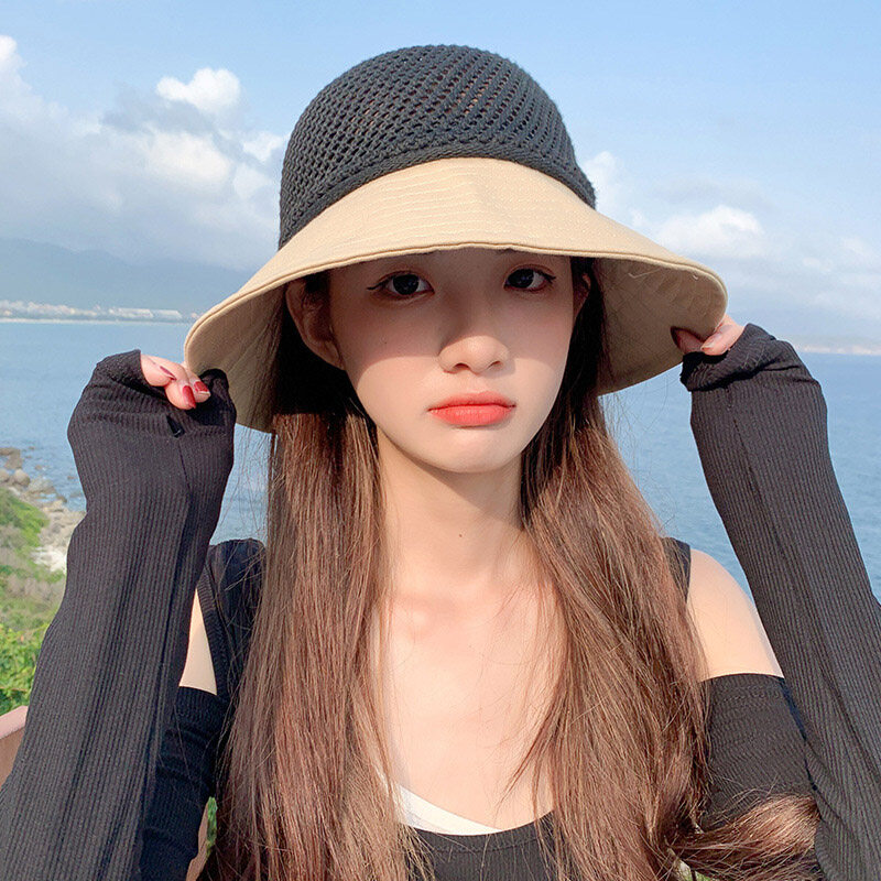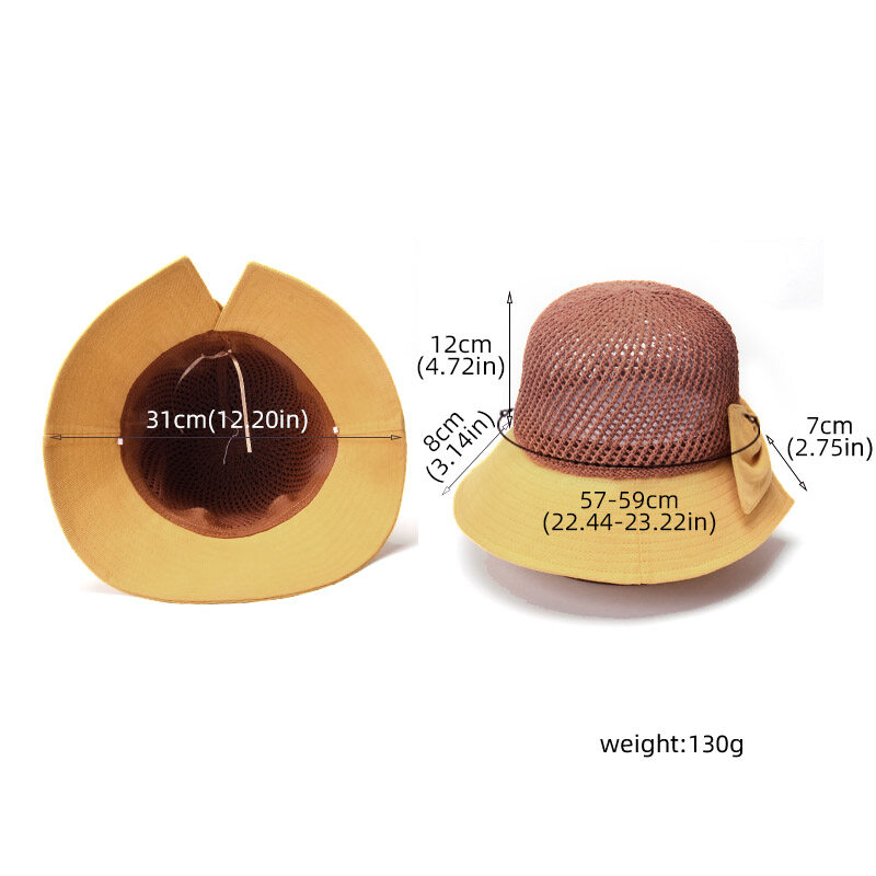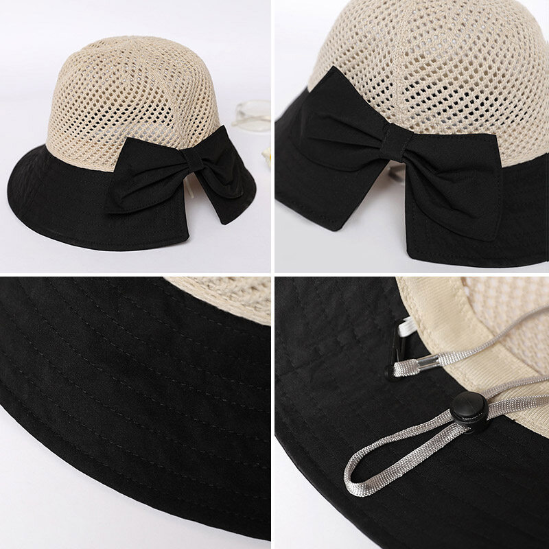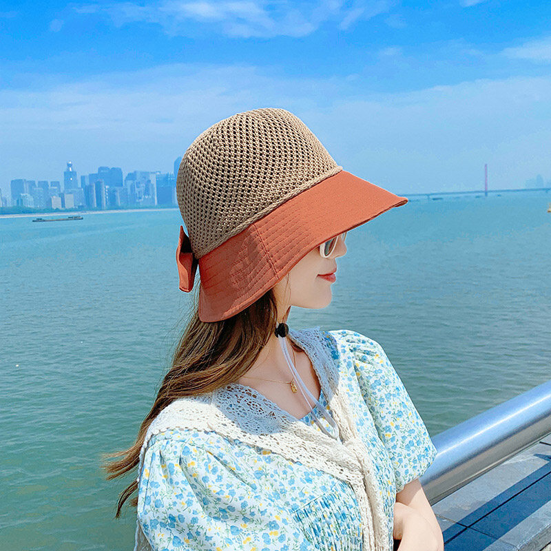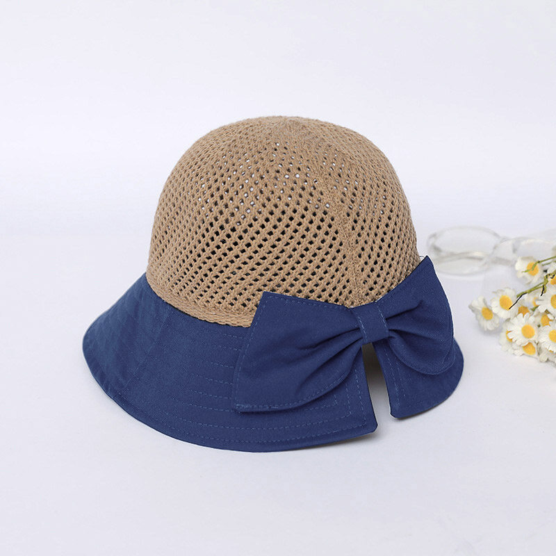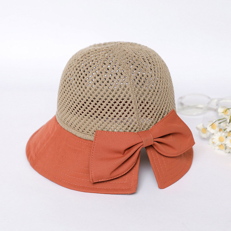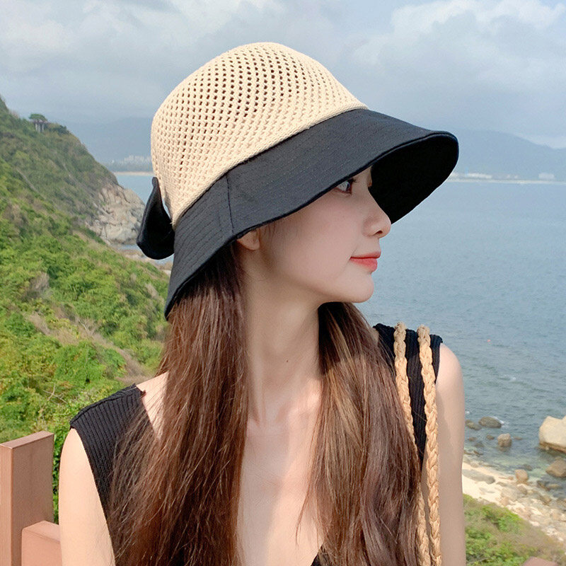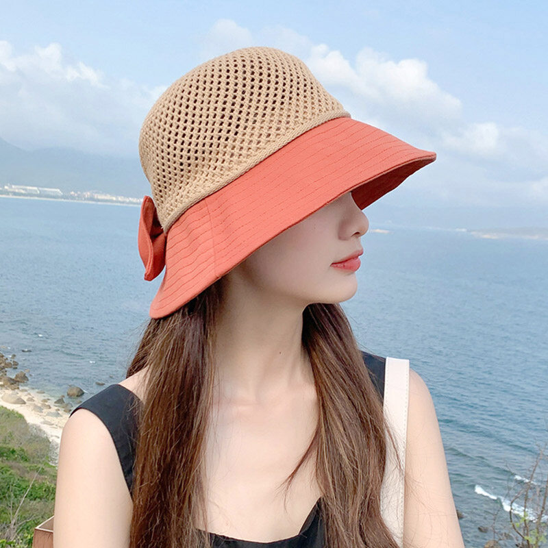 Summer Bow Decor Mesh Dome Bucket Hat for Women Anti UV Sun Hats Folding Outdoor Beach Caps Patchwork Female Cap