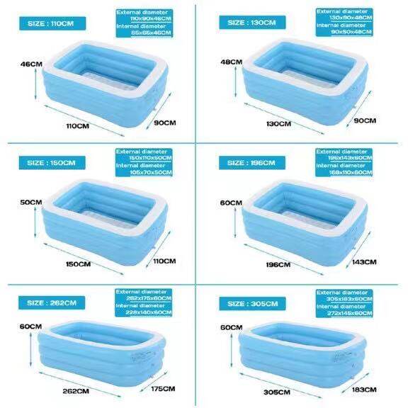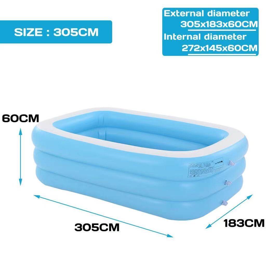 Product description:This product is suitable for new born and above, it is made off eco-friendly material.This product is adjustable, the user is able to adjust the height freely.This pool is design with safety valve so that it can be easy to inflate and deflate.The thickness matching for this swimming pool is the same as the thickness.After water is fill into it, the shape of the swimming pool will remain unchanged.This swimming pool is tough and durable, it is also cannot cut by a real knife.It is also built with three big valve so that user can adjust the height of the swimming pool by themselves.The fall point built on the bottom of the swimming pool can easily release water out of the swimming pool.Three layer design of this product is to prevent it from break and leakage.The water line inside the swimming pool have a top water line so that user can estimate the water level they want.Product features:External dimensions:- (L)150x(W) 110X (H)50cm (3kg)- (L)210 x (W)140 x (h) 65cm (5kg)- (L)262x(W)175x(H)60cm (6kg)- (L)305x(W)183x(H)60cm (8.2kg)-Multi purposes-showering, swimming, playing.-Eco friendly material-Thick, durable, & comfortable-Easy to carry & Store-Multi layer structure and valves-Material: eco-friendly PVCHow to play:-Guide your baby/kids to showering, swimming or playing inside this swimming pool-Firstly, use the electric pump to inflate the swimming pool.-User can adjust the height of the swimming pool when inflated according to their children height.-After user finish playing or swimming with their children, simply open the fall hole built below the swimming pool to easily send the water out of the swimming pool.Recommended for baby/kids. Adult supervision is need:** Suitable for how many people?1)(L)150x(W) 110X (H)50cm : 2-3 people2)(L) 210X (W)140x(H)65cm : 3-5 people3)(L) 260X (W) 170X (H)61cm : 5 -7 people4)(L)305x(W)180x(H)60cm : 7 - 8 people* Note:1. there will be 5-8cm differ due to manually measurement.2. color will be slightly differ due to different monitors or mobile screen showed.Parcel included:1PCs X swimming pool1PCs x electric pump (if selected pump)