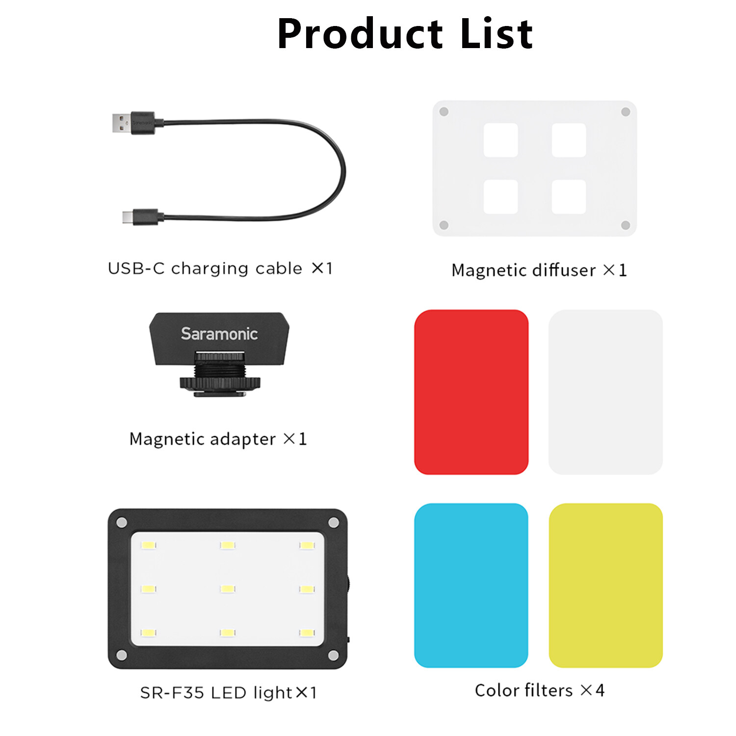Four color filters are included, providing users with flexibility to create colorful lighting effects for different shooting scenarios. The SR-F35 LED light is ideal for photography, video shooting, live streaming, podcasting, and more.