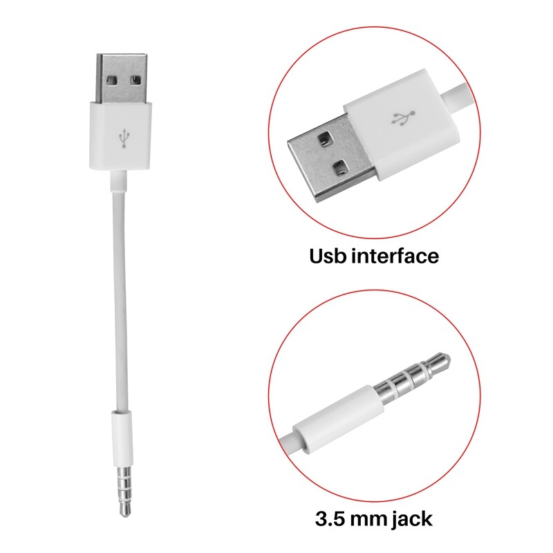 A USB cable for Apple iPod shuffle connects your iPod shuffle to a USB port on your computer for syncing and charging. You can also connect an Apple USB power adapter and easily charge through a wall outlet.