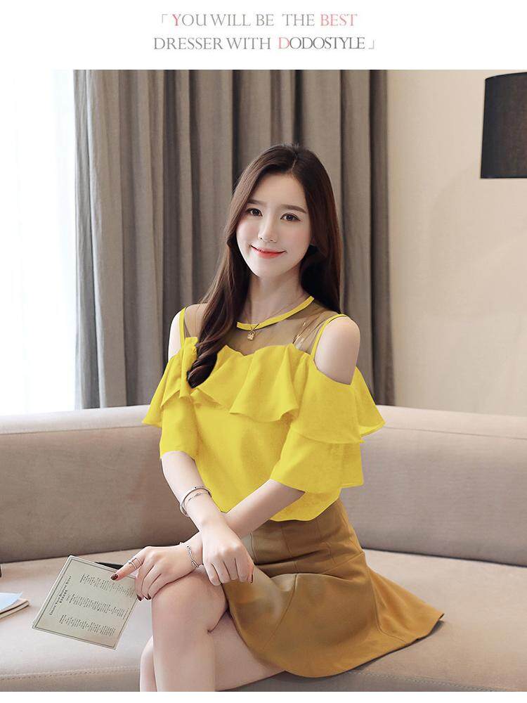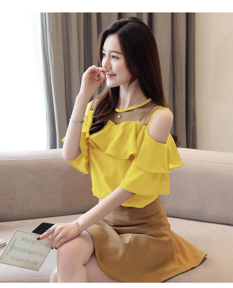 AFEG Summer New Solid Color Korean Round Collar Off Shoulder Camp Ruffle Fashion Loose Elegant Elegant Temperament Mesh Stitching Chiffon Trumpet Short Sleeve Top